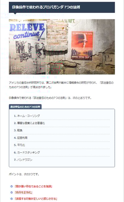 ナチス(国家社会主義ドイツ労働者党)も多用した情報操作を使った視聴者に対する思想誘導が、日本のマスコミ報道で多用されています。