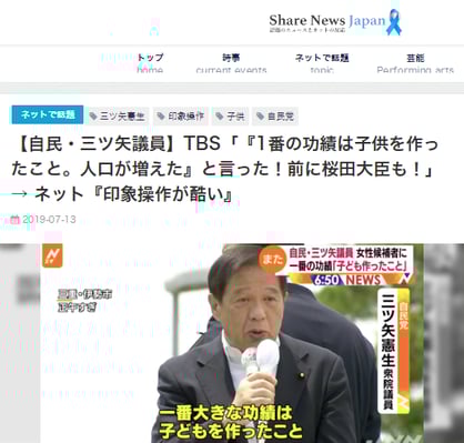 TBS「三ツ矢議員『1番の功績は子供を作ったこと。人口が増えた』と言った」