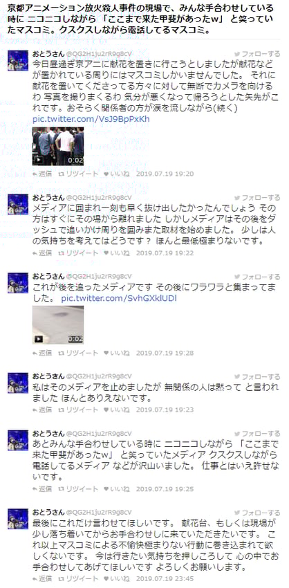 共同通信社京アニ遺族への書面が酷い。京都アニメーション放火殺人事件の現場で、みんな手合わせしている時に ニコニコしながら 「ここまで来た甲斐があったw」 と笑っていたマスコミ。クスクスしながら電話してるマスコミ。