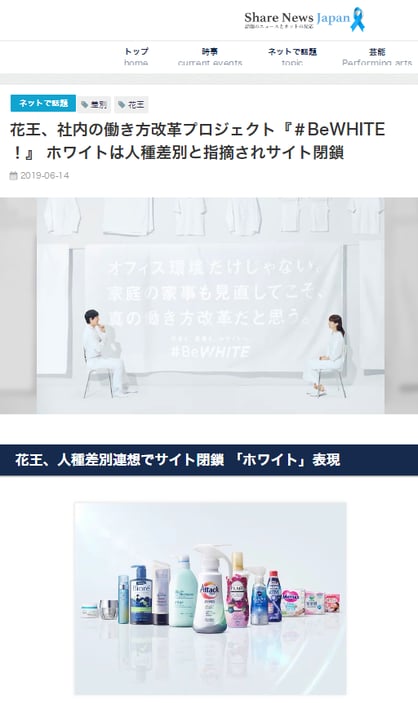 共同通信「花王、人種差別連想でサイト閉鎖 「ホワイト」表現」