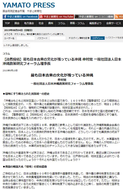 「沖縄はもともと琉球王国という日本とは別の国であり、1609年の【薩摩侵攻】により植民地として搾取支配され、一方、明や清とも朝貢冊封関係にあり日支両属の地位にあったが、明治12年の【琉球処分】により、強制的に沖縄県が設置され、琉球王国は滅ぼされた。」