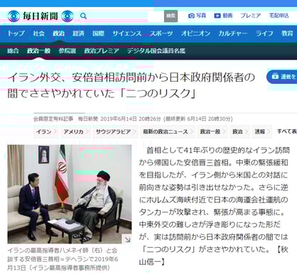 毎日新聞「イラン外交、安倍首相訪問前から日本政府関係者の間でささやかれていた「二つのリスク」」