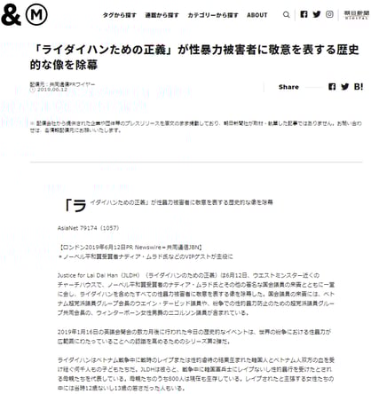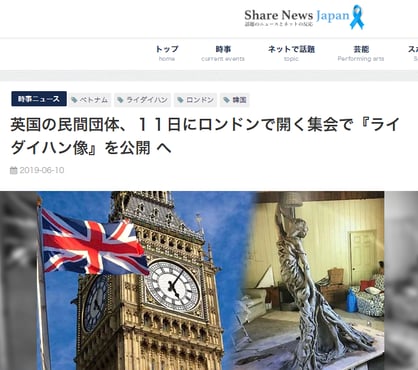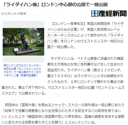 産経新聞は、8月1日にも、ロンドン中心部のウエストミンスター地区の公園で一般公開された「ライダイハン像」を記事にしていました。