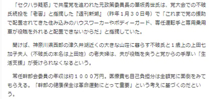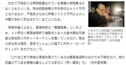 さらに、日本共産党は約20年も志位委員長(党首)の独裁が続いているが、その前任だった不破哲三氏(1989~2000年)は2006年まで議長(党三役・最高職)で、さらに未だに常任幹部会委員である。老害が高い地位を独占して、近所の小学校より広い家屋敷を持っている姿は、世界の共産主義国で見られる「赤い貴族」そのもの。