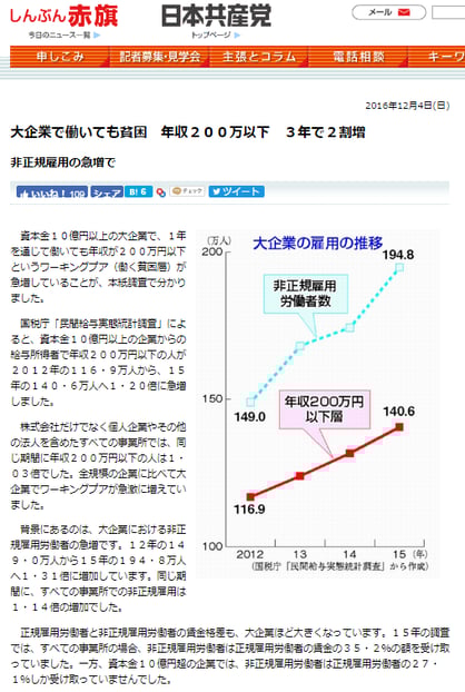 2016年12月4日のしんぶん赤旗の記事でも、「年収200万以下 3年で2割増」と書いているが、twitt_dragoon's diary の「ワーキングプアの増加だそうで」にも記載されているように「一般法人レベルでは正規も非正規も雇用が増大し、正規のほうがやや多い」のだし、「非正規率が高い」のは日本共産党が2019年の参院選で共闘した立憲民主党岡田克也議員の「イオン」なんですが?