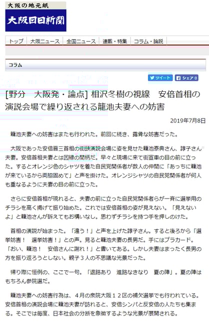 応援演説直後に配信された記事がこちらですが、この記事で籠池夫妻のすぐ隣でご長男が夫妻を諫めるプラカードを掲げていたこと、街宣車のすぐ前に陣取っていて安倍首相や候補者から死角になっていたこと、警察という公権力は籠池夫妻を守っていたことが読み取れますか?