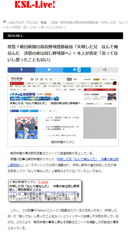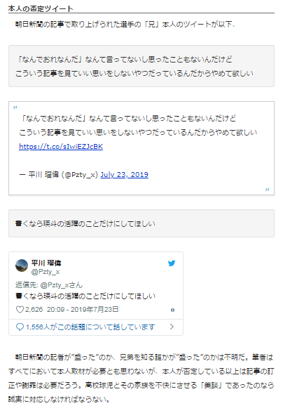 朝日新聞の記者が”盛った”のか、兄弟を知る誰かが”盛った”のかは不明だ。筆者はすべてにおいて本人取材が必要とも思わないが、本人が否定している以上は記事の訂正や謝罪は必要だろう。高校球児とその家族を不快にさせる「美談」であったのなら誠実に対応しなければならない。