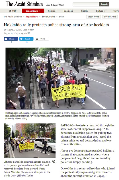 選挙期間中に安倍総理応援演説を妨害して排除された者を取り上げ、「事実上独裁体制下に生きている」との極端な主張を紹介。日本が強権的な後進国と海外に宣伝。