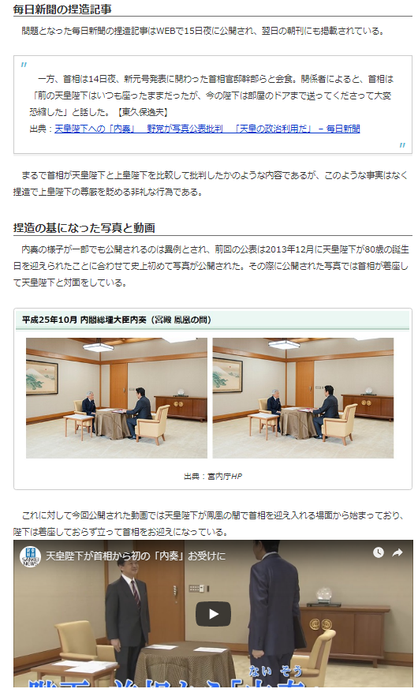 まるで首相が天皇陛下と上皇陛下を見比べて、上皇陛下を批判したかのように記載されているが、まったくの捏造で上皇陛下の尊厳を貶める非礼な行為である。