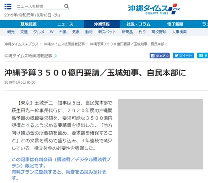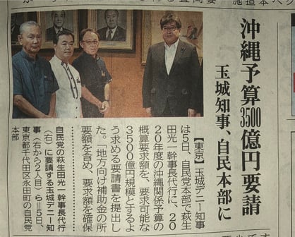 沖縄タイムスは、玉城デニー沖縄県知事とその取り巻きの北中城村長,読谷村長だけを残し、自民党本部で萩生田幹事長代理と面会をセットした宮﨑政久代議士をわざわざ除いた写真を紙面に掲載。