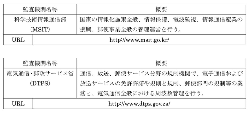 韓国の電気通信は、国家情報戦略及び情報通信産業、郵便事業全般、電波監理等の業務を行う科学技術情報通信部(Ministry of Science,ICT MSIT) (2017年7月に未来創造科学部から名称変更)と、放送内容や放送広告、個人情報保護等の放送・通信利用者保護、及び放送・通信に関する市場調査と放送チャンネル政策等も含む放送局全般の管理を行う放送通信委員会(Korea Communications Commission KCC) の双方により管理されている。