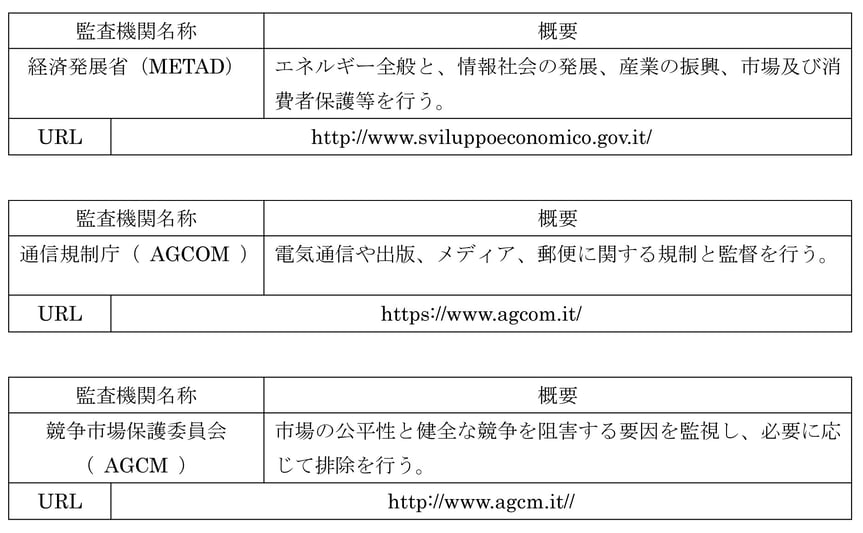電気通信事業者に対する規制監督や、周波数割り当ての決定、通信事業者に対する許認可等に関しては経済発展省(Ministero dello sviluppo economico)が行い、より実務的な内容に関しては通信規制庁(AGCOM)によって、ネットワークも含む電気通信と出版やメディア、及び郵便に対する規制と保護、通信に関しては周波数割り当て計画の作成、電気通信の保安全般等が行われる。また、メディアに関する多元性の保護も行う。競争市場保護委員会(AGCM)は、公正な競争と健全な市場形成、特に電気通信に関しては広告の規制等を行う。