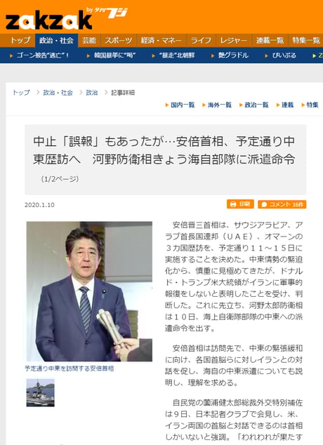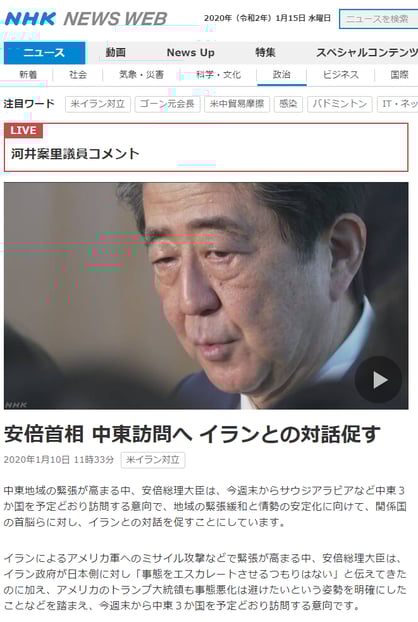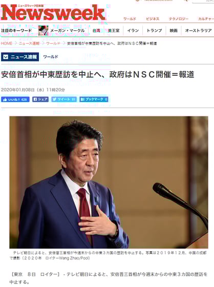 安倍首相の中東歴訪については、イランが、米軍も拠点とするイラク中西部のアル・アサド空軍基地などにミサイル攻撃をしたことを受け、一部メディアが「訪問の中止を決めた」と確定的に報じた。