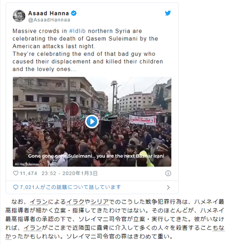ソレイマニ司令官に弾圧されていたシリアとイラクの両国では、人々が喜びを爆発させる「#テロリスト・ソレイマニ死亡(アラビア語)」の付いた映像や写真がSNS上に出回ったとNewsweekでは報じている。