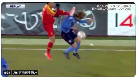 日本対中国戦で中国選手のDFジャン・ジーポンが、MF橋岡大樹の頭部にカンフーキックを見舞うラフプレー。