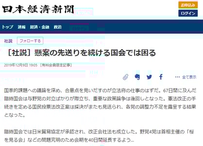 日経新聞「[社説]懸案の先送りを続ける国会では困る」