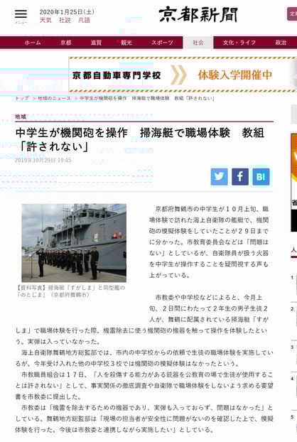 京都新聞「中学生が機関砲を操作 掃海艇で職場体験 教組「許されない」」