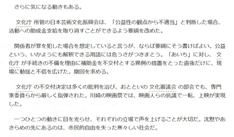 民主主義の発展には、不都合なことも表に出して議論を交わし、考えることが大切で、権力は無用の介入をしてはならない――。そんな近代社会の基本を理解せず、芸術への尊敬を欠く国だと宣言したに等しい。