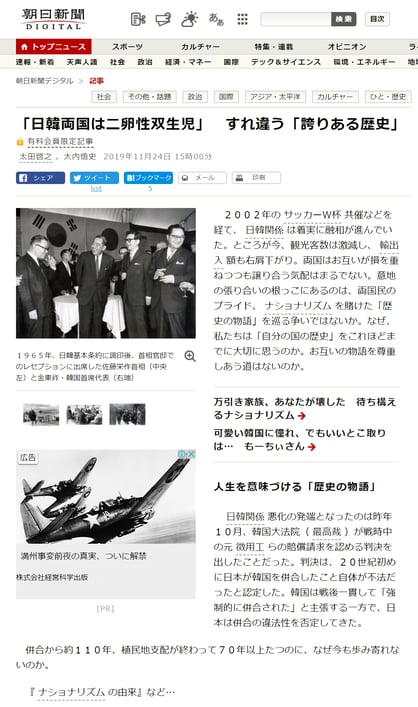 朝日新聞「「日韓両国は二卵性双生児」 すれ違う「誇りある歴史」」
