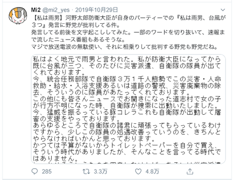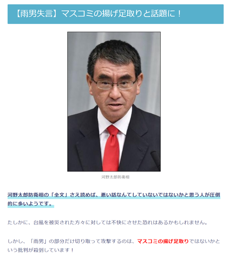 河野太郎と21世紀の日本を語る会についての報道ですが、「雨男」発言で批判される報道があります。