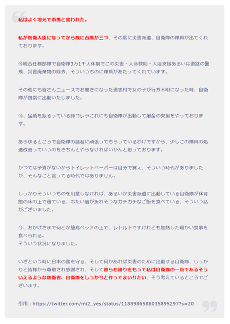河野太郎大臣のその会の挨拶ノーカット8:33になりますが、先ずはその全編を見て頂き評価をして頂けるようにお願いしたいです。