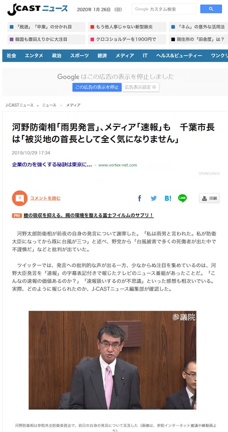 河野太郎大臣の「河野太郎と21世紀の日本を語る会」での「雨男」発言の一部を切り取り、文脈を無視して速報を打ち、