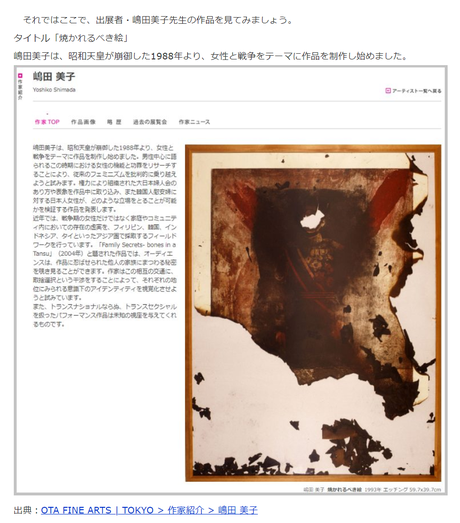 昭和天皇の写真を何度も燃やし、最後にその灰を土足で踏みにじる動画がそうである。昭和天皇とみられる人物の顔が剥落した銅版画の題は「焼かれるべき絵」で、解説には戦争責任を「日本人一般に広げる意味合いがある」とあった。