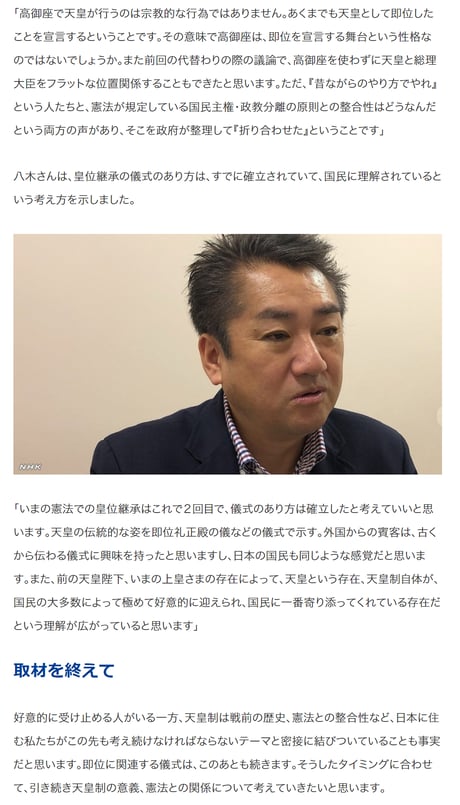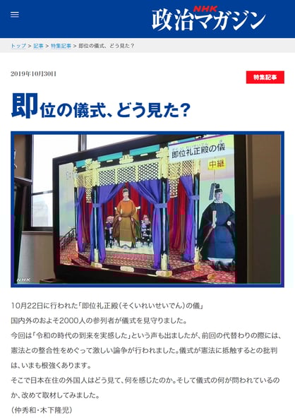 好意的に受け止める人がいる一方、天皇制は戦前の歴史、憲法との整合性など、日本に住む私たちがこの先も考え続けなければならないテーマと密接に結びついていることも事実だと思います。即位に関連する儀式は、このあとも続きます。そうしたタイミングに合わせて、引き続き天皇制の意義、憲法との関係について考えていきたいと思います。