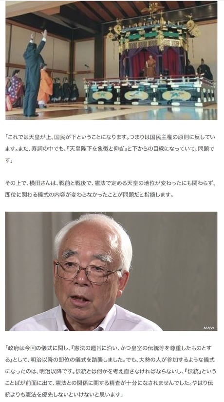 九州大学の横田耕一名誉教授です。明治期同様、神道形式で行われた今回の儀式は、憲法との整合性をめぐり、大きな問題点があると指摘しました。