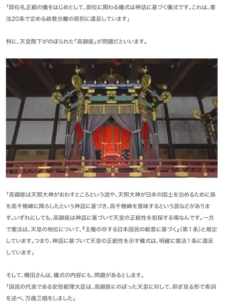 「即位礼正殿の儀をはじめとして、即位に関わる儀式は神話に基づく儀式です。これは、憲法20条で定める政教分離の原則に違反しています」(以下略)