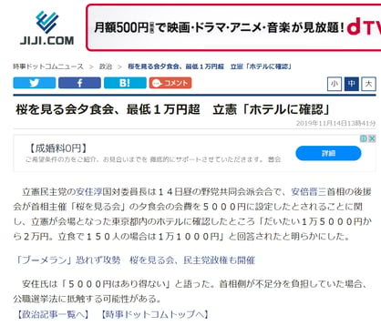 時事通信社「桜を見る会夕食会、最低1万円超」