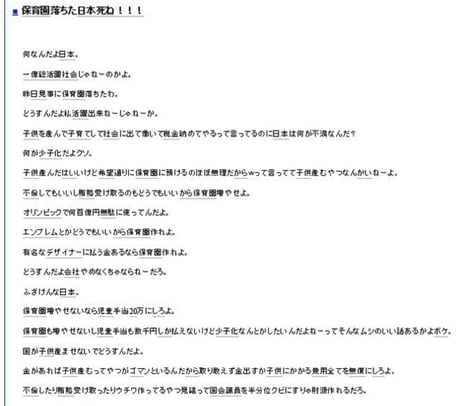 2016年(平成28年)、「何なんだよ日本。/一億総活躍社会じゃねーのかよ。/昨日見事に保育園落ちたわ」というつぶやきから始まる匿名ブログが大騒動を巻き起こした。