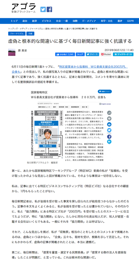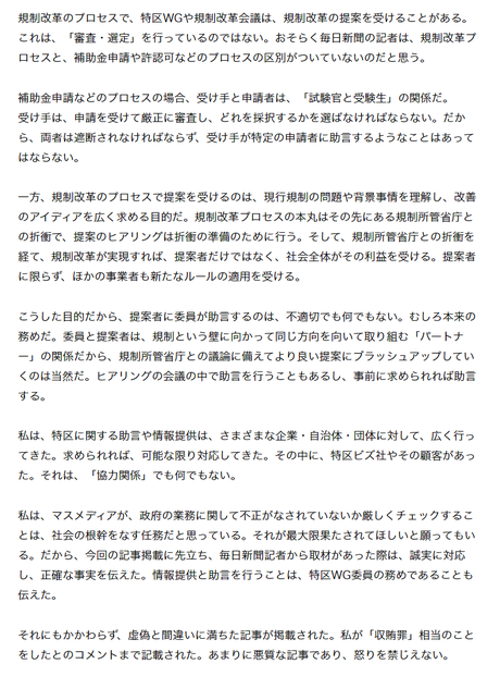 あたかも国家戦略特区ワーキンググループ(特区WG)委員の私が「指導料」を受け取ったかのような見出しと図が掲載されている。そのような事実は一切存在しない。