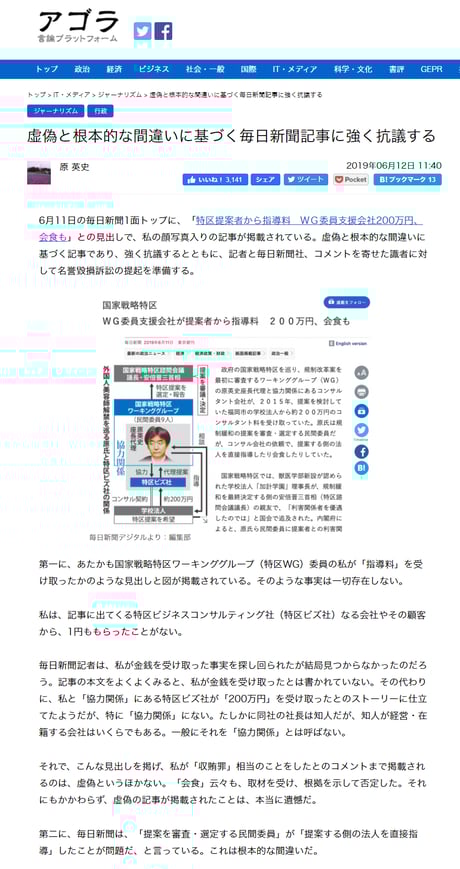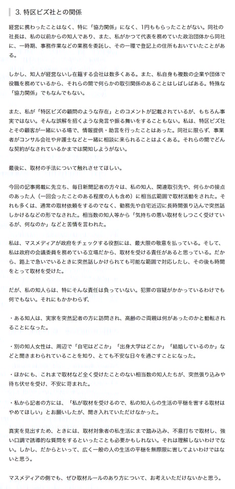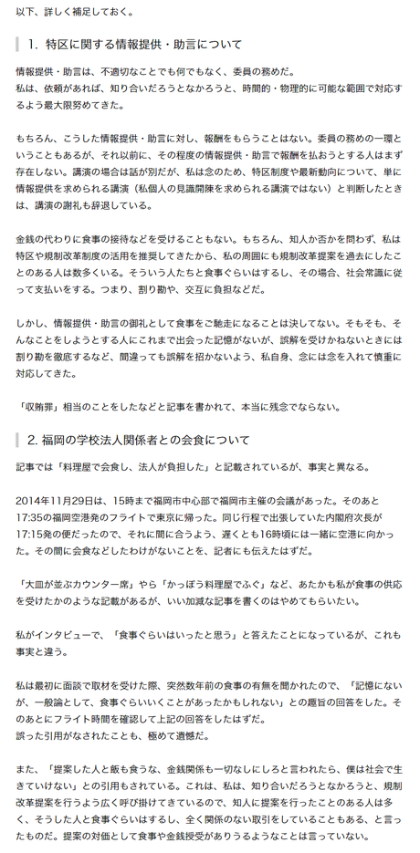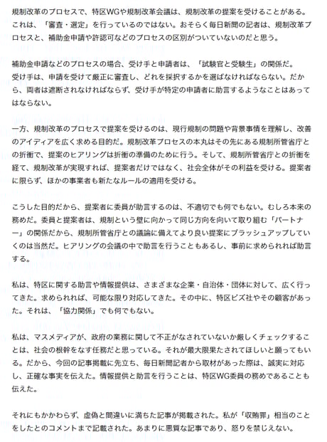 毎日新聞記者は、私が金銭を受け取った事実を探し回られたが結局見つからなかったのだろう。記事の本文をよくよくみると、私が金銭を受け取ったとは書かれていない。その代わりに、私と「協力関係」にある特区ビズ社が「200万円」を受け取ったとのストーリーに仕立てたようだが、特に「協力関係」にない。たしかに同社の社長は知人だが、知人が経営・在籍する会社はいくらでもある。一般にそれを「協力関係」とは呼ばない。