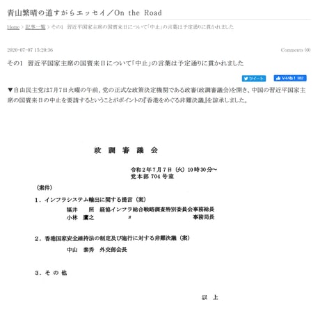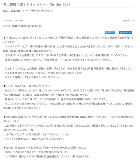 ------------------------ 青山繁晴氏 On The Road 2020.7.7