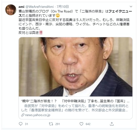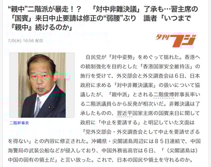 夕刊フジ「“親中”二階派が暴走!? 「対中非難決議」了承も」