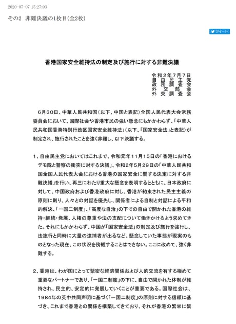 習近平国賓来日中止に反対する議員は5人だけだった。むしろ、非難決議にインド、西沙・南沙、尖閣の侵略、ウィグル、チベットなどの人権侵害も盛り込んだ。