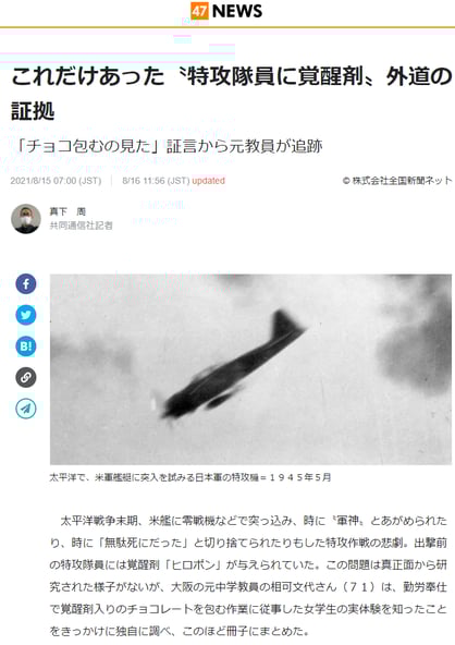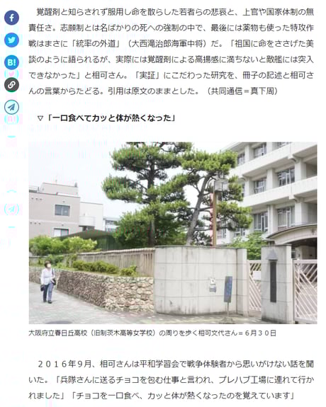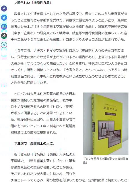 ・当時は疲労回復薬として合法だったからな。民間でも使われていたし、現在でも処方薬ですね。軍隊だけを切り取るのは偏向だな。結論ありきの研究。育ちはいいらしいが、まともな研究者としての教育を受けていないのか、この方の限界なのか、とんでもない元教育者だな。47NEWS。日本のマスコミという名の正体というか知性が知れるな。