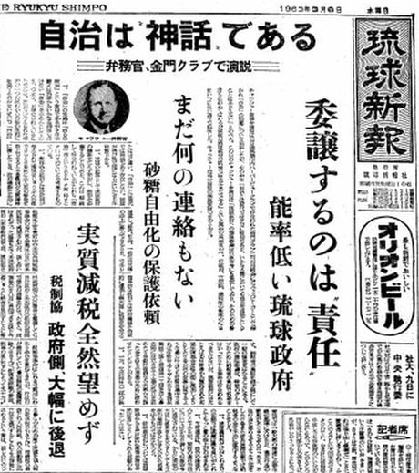 「自治は神話」「自治への欲求は自らの『無能力と無責任』を隠すため」。講和条約第3条下で琉球政府を「下級の行政機関」と呼び、自治は「不可能だ」と断じた。