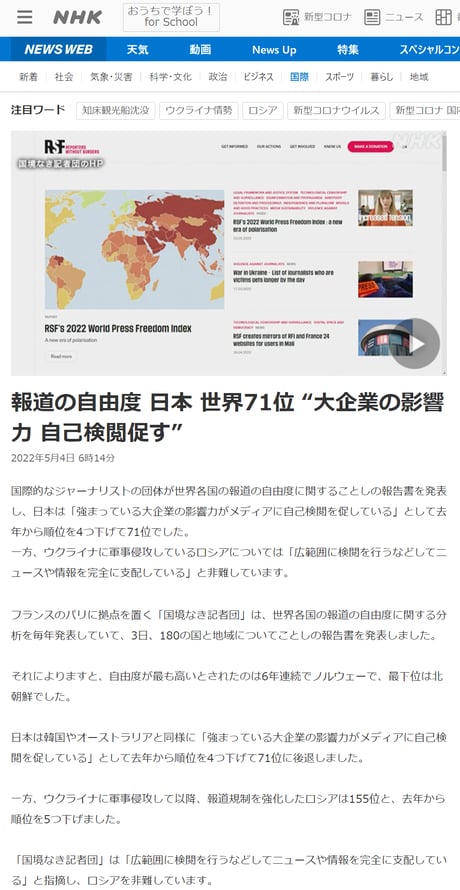 国際的なジャーナリストの団体が世界各国の報道の自由度に関することしの報告書を発表し、日本は「強まっている大企業の影響力がメディアに自己検閲を促している」として去年から順位を4つ下げて71位でした。