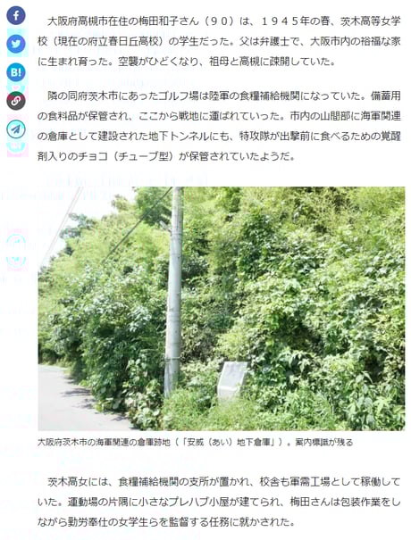 隣の同府茨木市にあったゴルフ場は陸軍の食糧補給機関になっていた。備蓄用の食料品が保管され、ここから戦地に運ばれていった。市内の山間部に海軍関連の倉庫として建設された地下トンネルにも、特攻隊が出撃前に食べるための覚醒剤入りのチョコ(チューブ型)が保管されていたようだ。