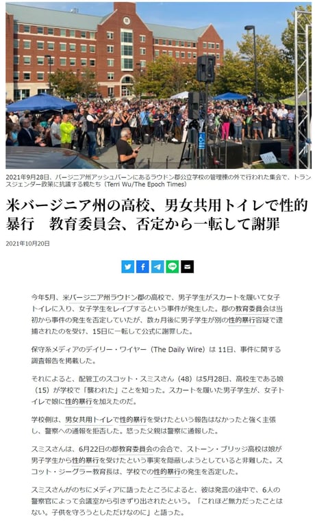 ・『トランス女子』を名乗る男子生徒に女子トイレでレイプされた事件は、被害を訴えた父親が『LGBT差別だ』と批判され、その加害男子生徒が他の高校でもレイプ事件を起こして逮捕されるまで『差別主義者』として批判され続けた