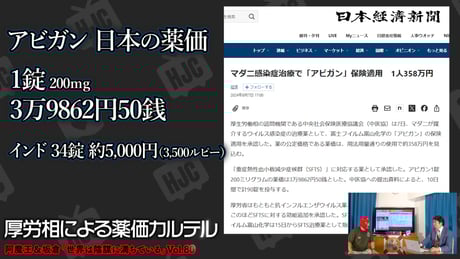 アビガンの薬価 外国との価格差 日本 1錠200ミリグラムで3万9862円50銭 インド 34錠のストリップ包装当たり3,500ルピー(約5,000円)