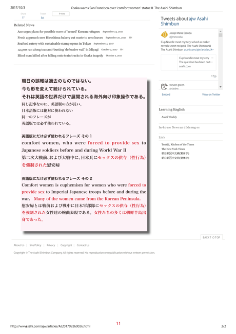 慰安婦関連の英語版記事には、日本語版には絶対に登場しないcomfort women who were forced to provide sex to Japanese soldiers という表現を必ず挿入する朝日。強制連行、性奴隷化の印象操作をせっせと続けています。