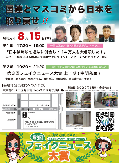 仲村覚理事「ファイクニュースの中でも最も危険で最も成功しているから。『首里城はウチナーンチュの魂。だから絶対に再建にしなければならない。』と呼びかけて沖縄だけでなく、全国各地から再建支援のカンパが集まっている。その中に危険な罠が仕掛けられているが、それに誰も気が付かず、気がついたとしてもその流れは、もはや誰も止められない。危険な罠とは、この文脈でいう「チナーンチュの魂」とは、すなわち、「日本に滅ぼされた琉球王国」であり、沖縄の人々を先住民族とする国連勧告を基準に考えると「首里城は日本の先住民族である琉球民族の魂」であるということになる。そこで、琉球新報の識者は、口を揃えて、「首里城は県民主体で再建されなければならない」と主張する。すなわち、「首里城は日本に滅ぼされた琉球民族の魂であるから、その末裔である琉球人が主体となって再建しなければならない。」ということである。しかし、首里城は国有公園であるため、日本政府主体で再建が進められるということがきまっている。このような状況に対して、この連載で登場した識者たちは、国連の人権機関に対して「琉球人の先住民族の自己決定権侵害されている。」と訴えることが予想される。首里城再建が新たたな国政的先住民族問題としてエスカレーションされ琉球独立工作の決定打となる危険性があります。」