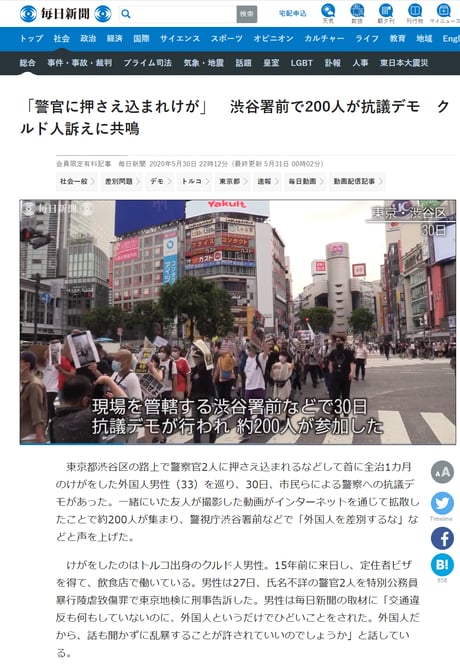 毎日新聞「「警官に押さえ込まれけが」 渋谷署前で200人が抗議デモ クルド人訴えに共鳴」