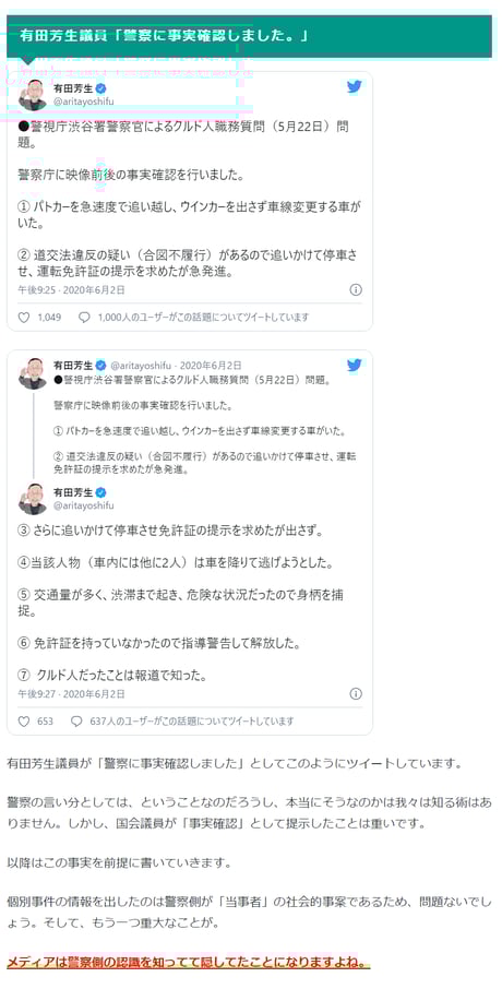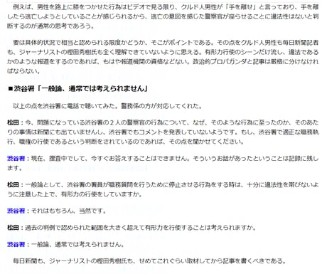 警察の適法な業務行為をさも問題があるかのように、しかも人権問題にすり替えながら報じ、視聴者に疑問を抱かせないよう映像を加工するなど悪質なプロパガンダ報道である。
