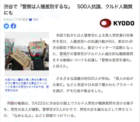 共同通信「渋谷で「警察は人種差別するな」 500人抗議、クルド人職質にも」