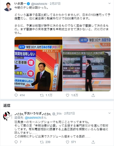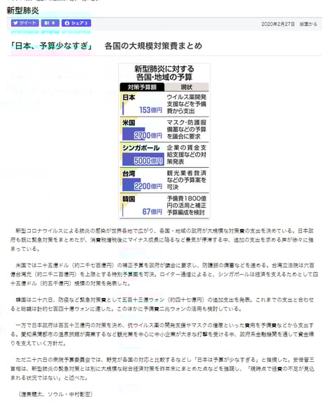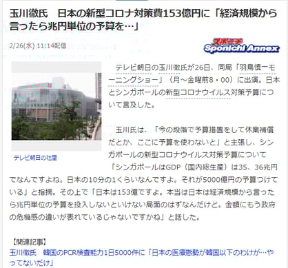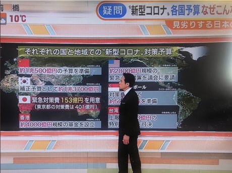 今朝のテレ朝は酷かった。 どういう基準で各国比較してるかわかりませんが、日本の153億円って予備費だし、他に資金繰り融資枠だけで5000億円あります。