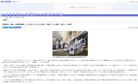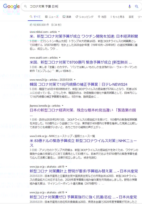 Google検索で「コロナ対策 予算 日本」で、なぜか首相官邸や日経新聞の記事は上位に来ず、「日本の予算が少ない」という日本共産党やTBSなどが上位に・・・・